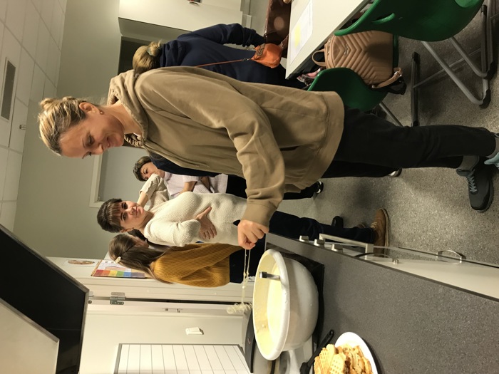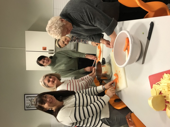 Flyktningtjenesten hadde forberedt matlaging og aktiviteter for barna. Det tok ikke lang tid før grønnsaksuppe og vaffelsteikinga var i gang blant de mange damene og de tre mannfolka (Ø og B ikke medregnet!) som var til stede. For barna var det forberedt ansiktsmaling og tegnesaker.