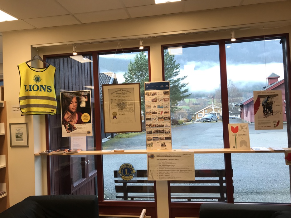 Vi har i dag montert en liten utstilling, dvs. en presentasjon av Lionsklubben vår i det store vinduet på biblioteket i Øyer. Gjennom hele frivilligåret har forskjellige lag og foreninger i kommunen hatt anledning til én måneds presentasjon på denne måten. Og november er altså reservert for oss.