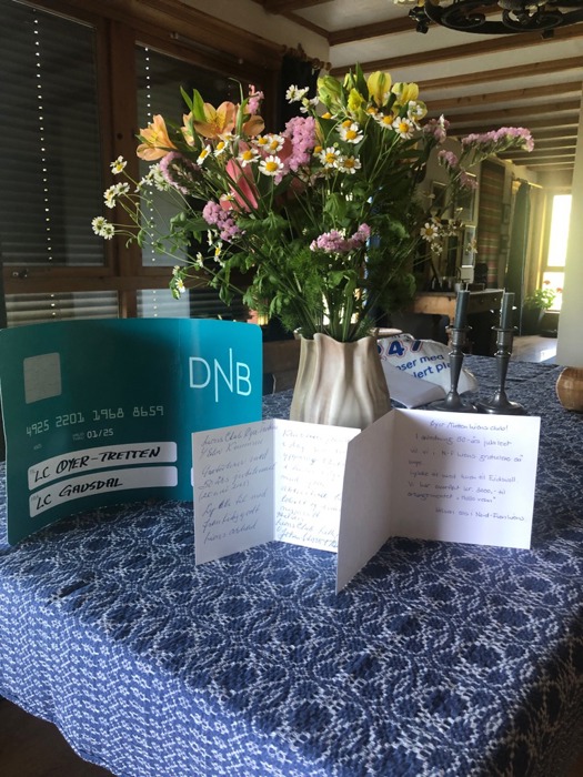 Dagen ble avsluttet med jubileumsmiddag i Wergelands hus ved Eidsvollsbygningen. Her ble det servert tre retters middag fra en historisk 1814 meny. Toastmaster Øyvind loste oss trygt gjennom. Taler ble holdt av president Eiliv og chartermedlem Lars Erik Høgvold som gav oss høydepunktene i historien vår gjennom 50 år. President Kjell Gulaker i Gausdal og sekretær Bjørn Sandbu fra Nord-Fron gratulerte oss med dagen og gav oss pengegaver som vi vil gi videre til HalloVenn. I tillegg refererte Eiliv til en flott bukett blomster og hyggelige ord som vi har fått fra LC Lillehammer. Vi har tidligere fått hilsen og pengegave fra LC Ringebu -Fåvang. Takk til alle!